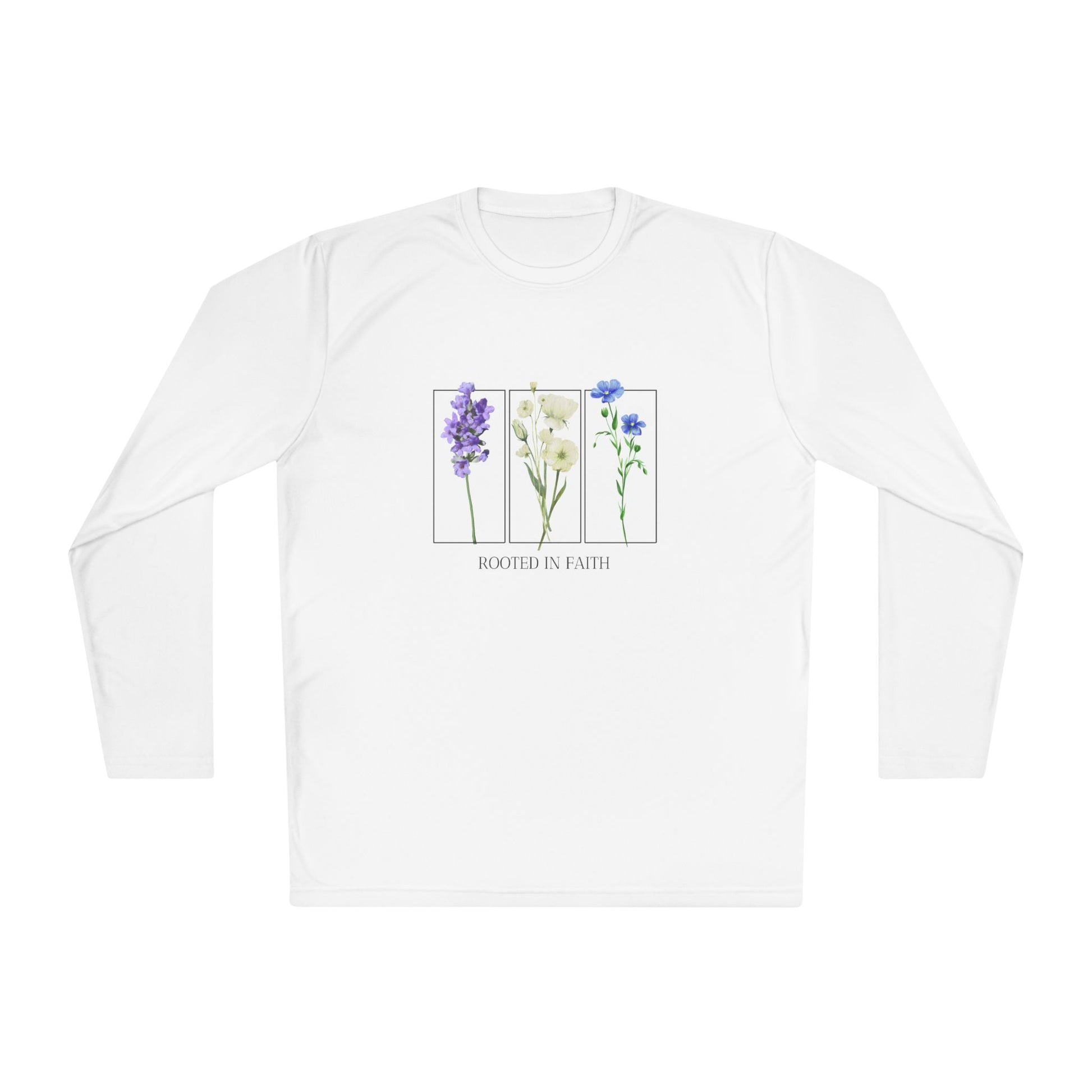 A rooted in faith long sleeve t-shirt with delicate flowers design. This lightweight, long sleeve tee is perfect for those who want to showcase their faith in a subtle and stylish way. It offers a relaxed and comfortable fit, making it ideal for casual wear or workout sessions.